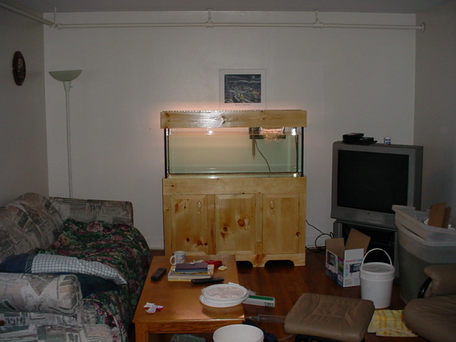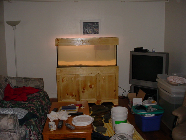 Below are some photos we took while first setting up the aquarium. you will see the tank with just water in it, then some sand, then the rockwork and then some plants. Then you will see a temporary stocking of fish that will stay only for a few days until the Real Fish arrive. You can enlarge any of the photos below by clicking on them.