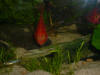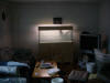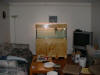 This house contains a 50 gallon hexagonal corner tank on an attractive stand, as well as a new 66 galloon aquarium on a knotty pine cabinet which we built. They are both community tanks with a variety of tropical fish in them like Zebra Danios, Pearl Danios, the dreaded Blood Parrot, and the equally awful painted tetras. ( both Blood parrots and Painted tetras have been dyed to get their colours and the blood parrot is a totally man-made fish and as such is an abomination )