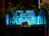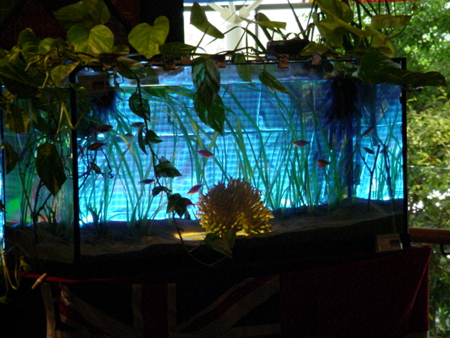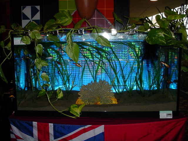 So I used Australian Rainbow Fish ( Glossipus incisus ) as the fish. They are a brilliant red colour with gold flecks and a distinctive shape. I used Giant Valisneria along the back of the tank to create a wall of "kelp", and a large and beautiful hunk of coral in the centre of the tank which was spotlighted from below to accent it and help create the illusion of a marine tank. I removed the top of the aquarium completely and used some live tropical plants to ring the top of the tank, rooting them in the sand inside the aquarium..