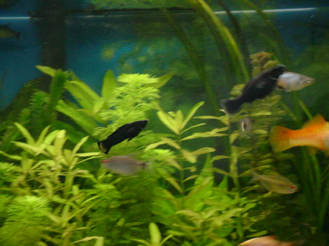 The largest is a 90 gallon and is full of convict cichlids, ( pronounced "sick lids" ) the smaller tank is a 30 gallon and has a breeding pair of marble angelfish in it.