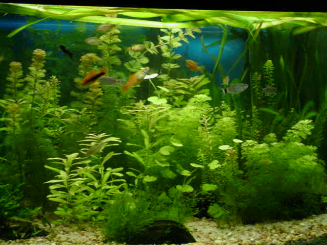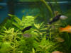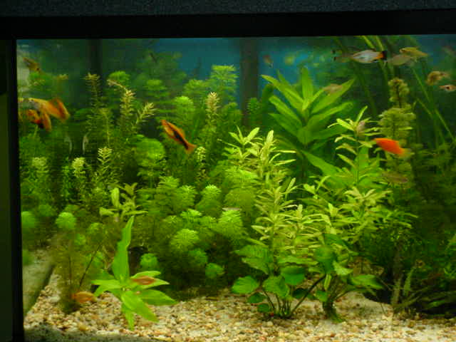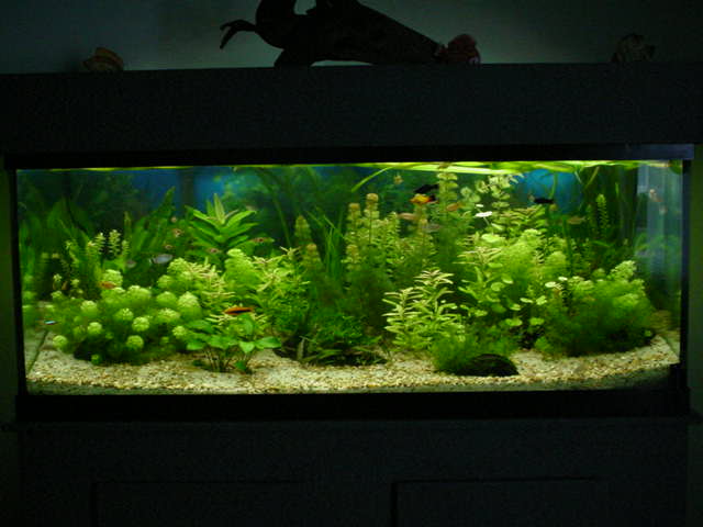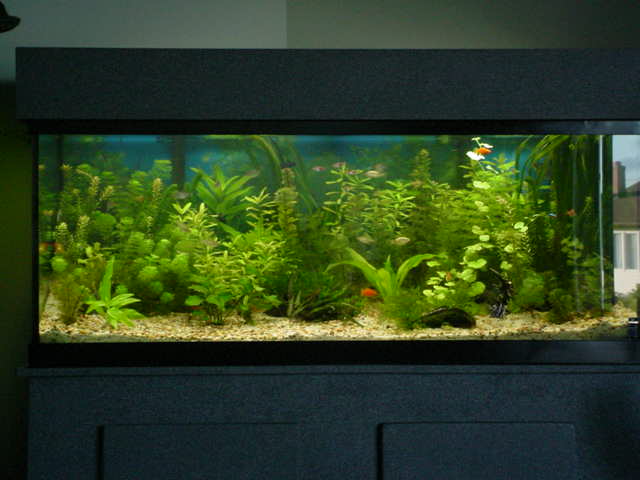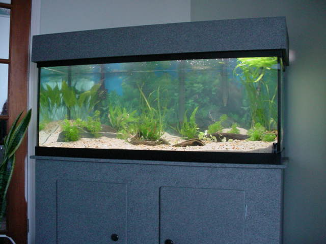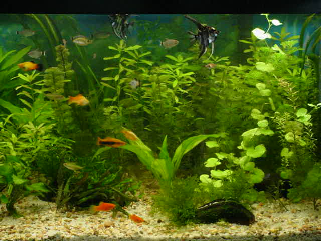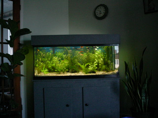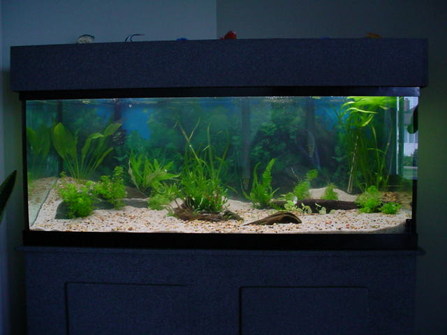 The photos on this page were taken before the present set-ups. On this page you see the 90 gallon aquarium as a beautifully planted community tank. Craig does not keep his tanks for long, losing interest and patience with them. In the short time I have known him ( approximately five years ) he has had a 130 gallon african cichlid tank, which he then changed to a saltwater tank. He then purchased a 50 gallon corner tank with Convict Cichlids, He sold that about three weeks later. He changed the 130 gallon for a 90 gallon and kept goldfish in it, a couple of months later he got a ten gallon tank for the goldfish and then purchased the 30 gallon tank which he turned into a community tank. The goldfish were given away and that tank was then heavily planted and changed into a community tank. Then he got rid of those fish and filled the tank with a school of juvenile marble angels. He then moved two of these angels into the then empty 30 gallon aquarium and gave the rest of the angels away filling to 90 gallon with Convict cichlids. He is now contemplating removing the convicts and changing it back to an african cichlid tank. This is why the photos on this page are not up to date.....I cannot keep up with the changes !!!!! ( sorry Craig, I tell it like it is ! )