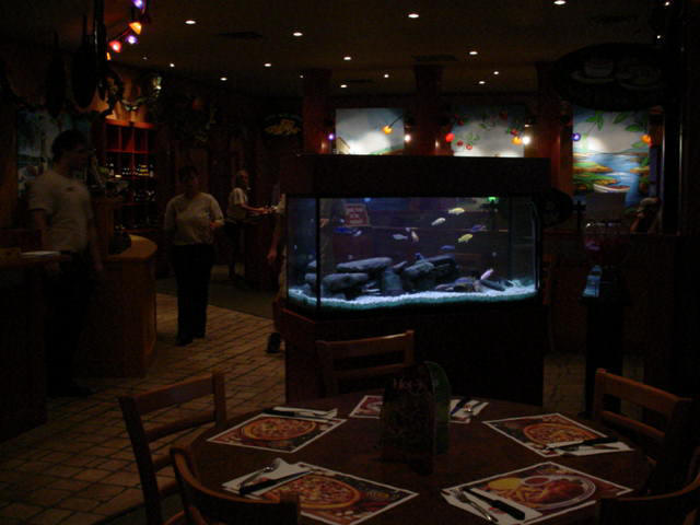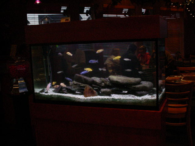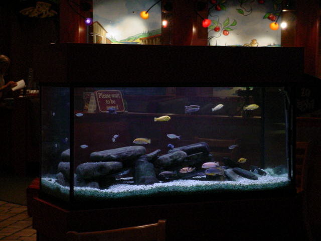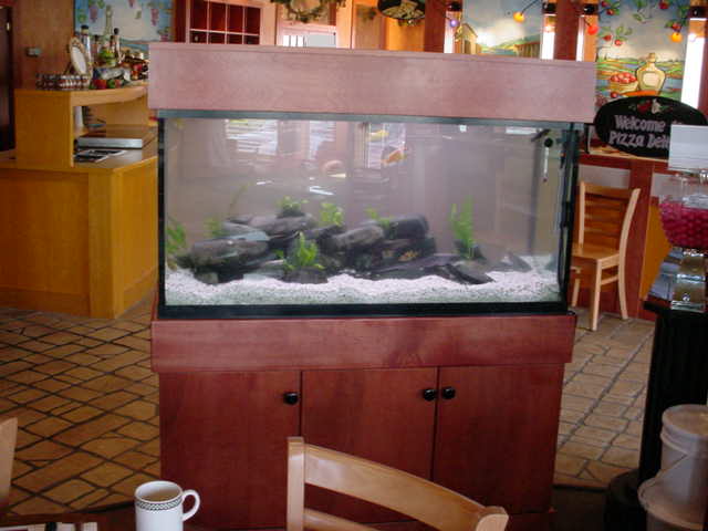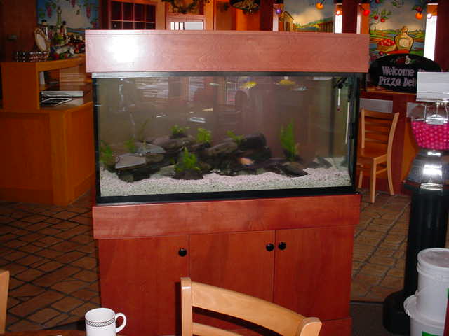 This tank was installed in April of 2003. It is 75 gallons, and stands in the foyer of the Pizza Delight Restaurant on Topsail Road in Paradise. It acts as a barrier between the front doors and the seating area of the restaurant.